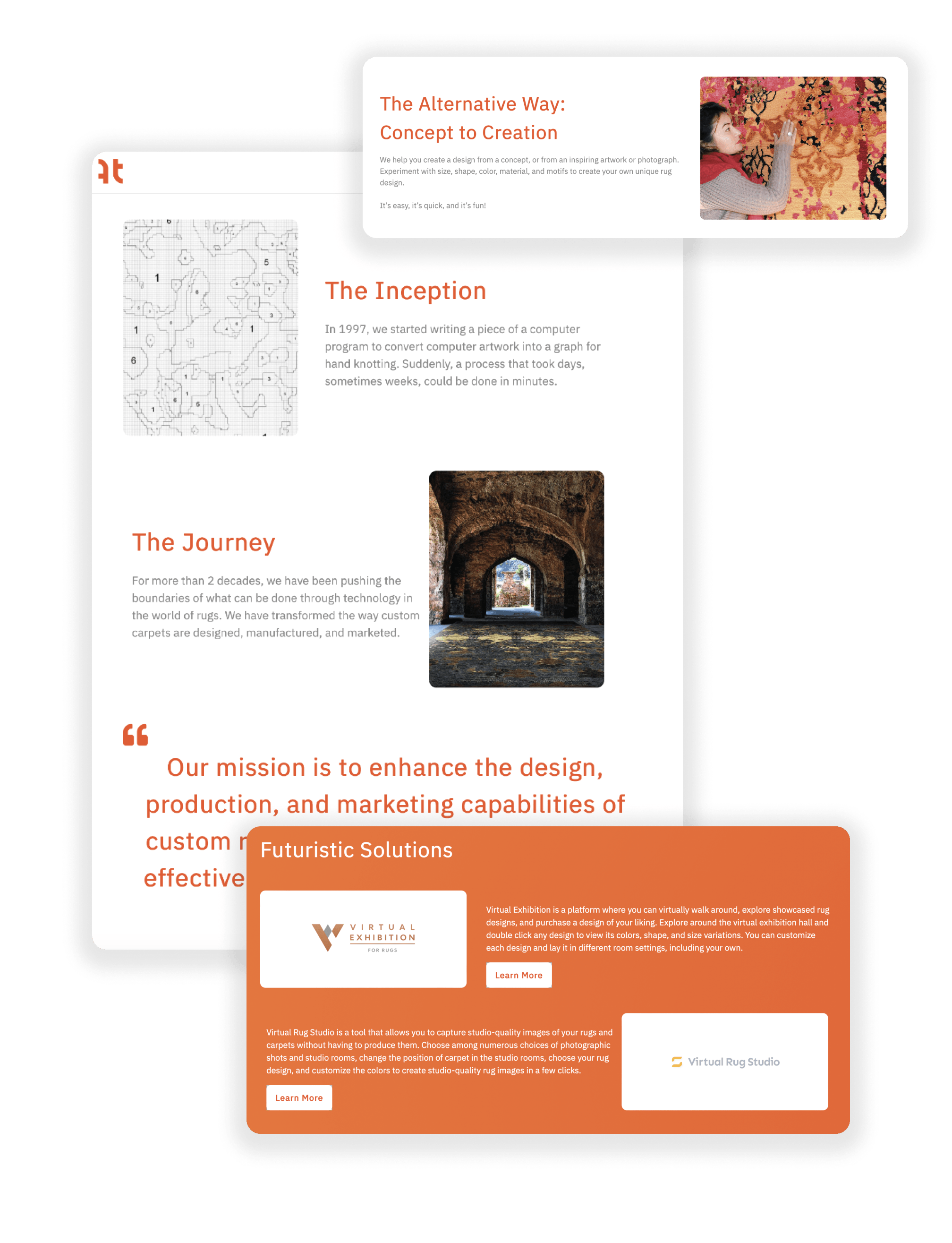 One of Alternative Technology's key innovations is their life-like rug visualizations - which enable manufacturers to visualize (and even sell!) their custom carpets even before making them. We felt that this was important to showcase, and so, we crafted small UI elements that highlight these visualizations. Similar thought and care were given to other key areas to perfect the visitor experience, and to give them a sense of what makes Alternative's products special.